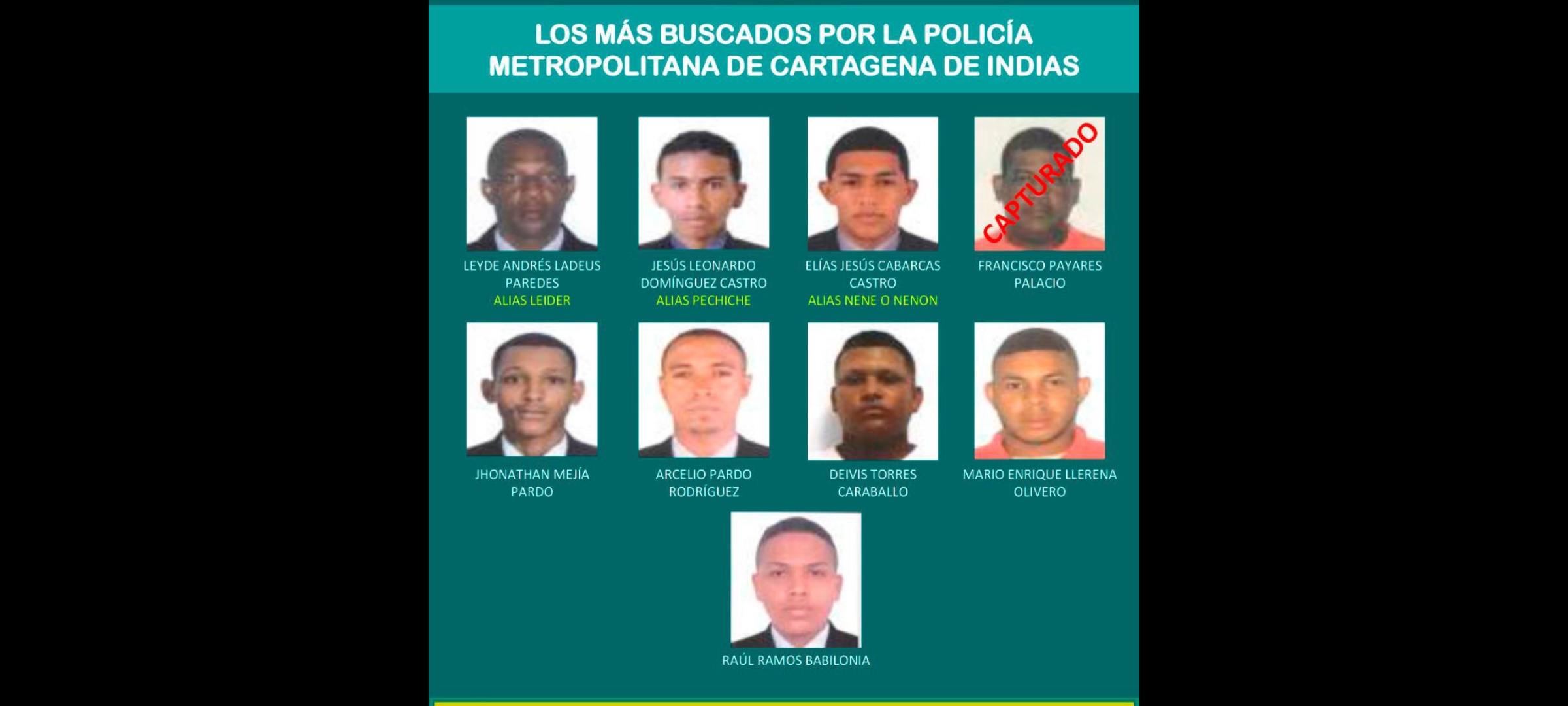 La Policía Metropolitana de Cartagena publicó un cartel con los nueve hombres más buscados en la ciudad. Sin embargo, faltan ocho por capturar, pues ya uno de ellos está en manos de las autoridades.